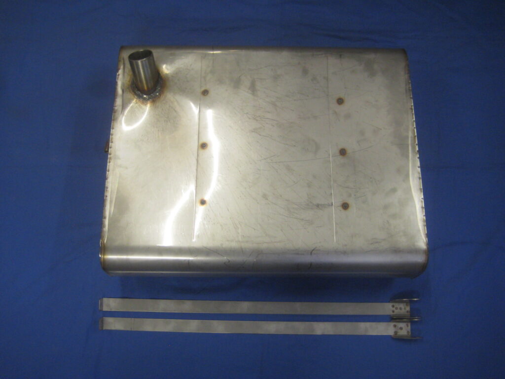 HERE WE HAVE A STAINLESS STEEL STRAP TYPE PETROL TANK INCLUDING THE TWO STRAPS