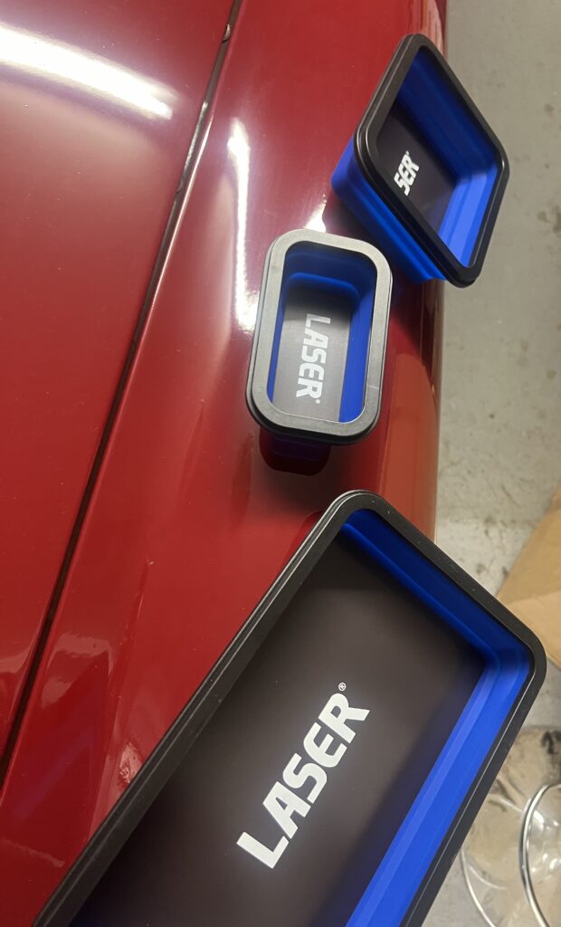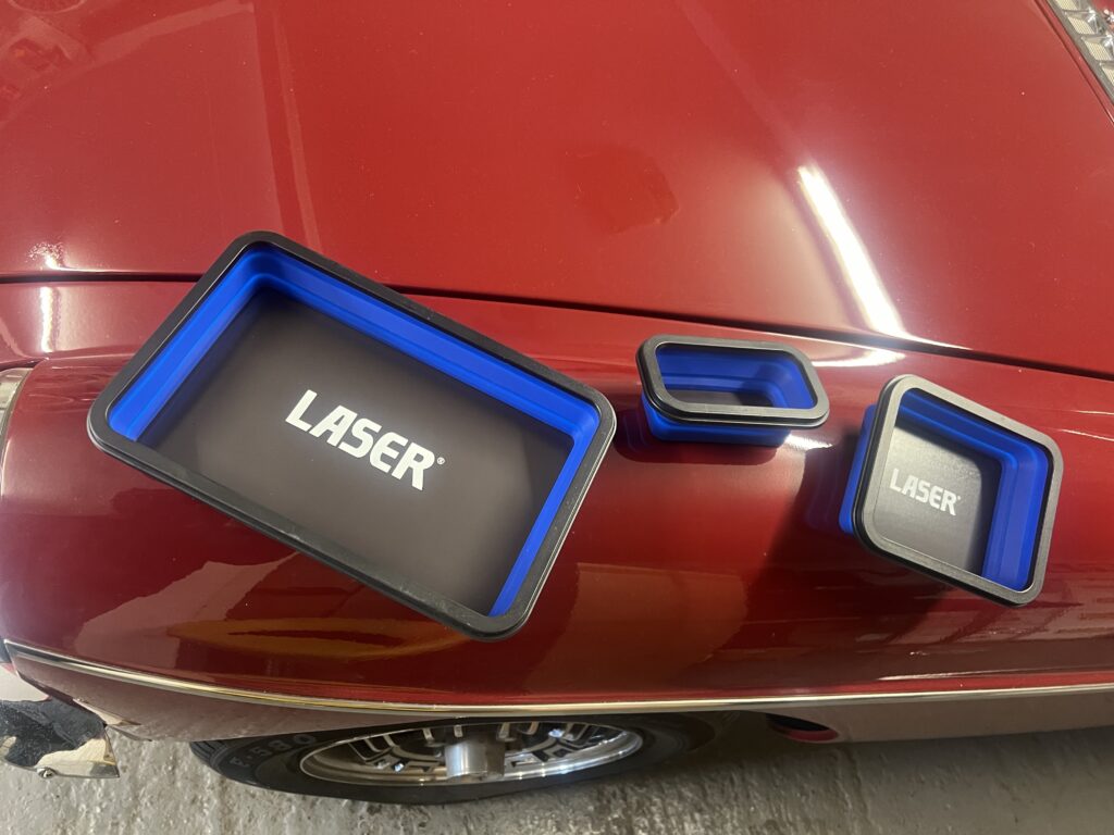 Here we have a set of 3 different size magnetic trays to use while using on your vehicle to keep loose nuts and bolt etc safe, the edge push up to make a deeper bowl like tray also. Please see photos, with them on one of our MGB’s. Great gift item.
