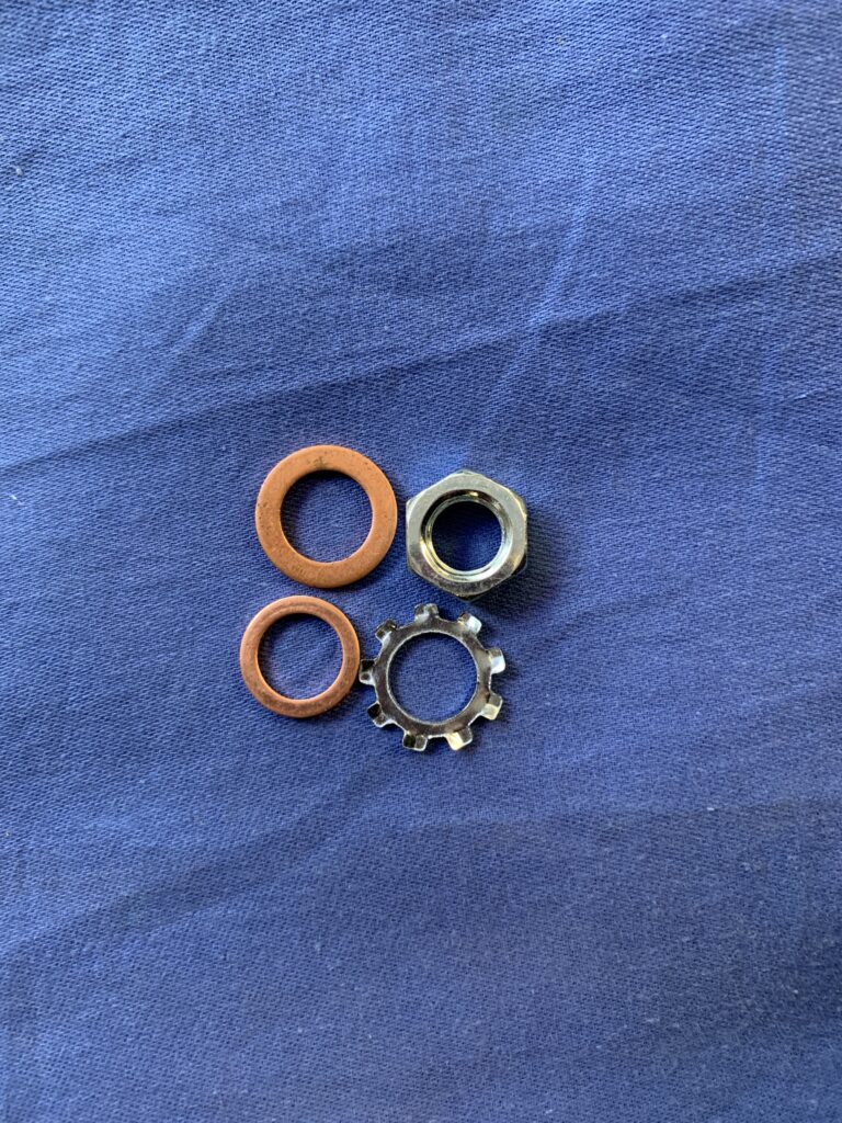 HERE WE HAVE THE BRAKE HOSE NUT, STAR WASHER AND 2 COPPER WASHERS FOR THE BANJO UNION ON THE FLEXI BRAKE HOSES
